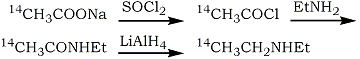 Thionyl chloride (160 mg) in dry ether (1 ml) was added to sodium 14C1-acetate (7.25 mg; 5 mCi) dried over P2O5 under vacuum. The mixture was stirred for 20 min at room temperature and then similarly dried sodium acetate (63 mg) was added. After stirring for a further 20 min the solvent was removed and the solid washed with dry ether (3x1 ml). The pooled solution was stirred, ethylamine (300 mg) in dry ether (2 ml) added slowly drop by drop and after cooling to 0°C the precipitate was filtered off. The filtrate was then evaporated at 0°C by a stream of dry nitrogen; the residue was taken up in dry ether (2 ml) and analysis showed a chemical yield of N-ethylacetamide of 55% (GLC) and a radiochemical yield of 48% (liquid scintillation counting, The solution of N-ethyl-14C1 -acetamide in dry ether (1.5 ml) was added drop by drop to a stirred suspension of LiAlH4 (160 mg) in dry ether (4 ml) at 20°C and the resulting mixture was stirred at room temperature for 16 h. The suspension was then boiled under reflux for 3 h and after cooling to 0°C, water was added drop by drop to decompose the excess LiAlH4. A violent reaction occurred with loss of some radioactivity from the top of the condenser. When the reaction stopped. the mixture was transferred to a stoppered test tube, washed in with 10% NaOH, and saturated with NaCl. The mixture was then shaken vigorously and the ether layer removed after it had separated. The aqueous phase was re-extracted with ether (4x2 ml) and the pooled extracts dried over Na2SO4. Analysis gave a chemical yield of diethylamine of 31% (GLC) and a radiochemical yield of 32% (liquid scintillation counting) with respect to sodium acetate.