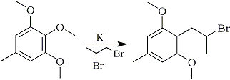 A solution of 5.1g (28 mmol) of 3,4,5-trimethoxytoluene in 5 ml anhydrous THF was added dropwise to a mixture of 3.3g (84 mmol) freshly cut potassium metal in 20 ml anhydrous THF and vigorously stirred at room temperature. The mixture was stirred for 24 hrs at room temperature and then chilled to 0°C. Then 8.5g (42 mmol, 1.5 eq) 1,2-dibromopropane dissolved in 5 ml anhydrous THF is added slowly and the resulting mixture was stirred for 4 hrs. The reaction was quenched by dropwise addition of 10 ml H2O and extracted with 3x30 ml Et2O. The organic phase was collected, washed with 50 ml H2O, dried with CaCl2 and evaporated to afford a 70-80% yield of crude product, which can be purified by distillation or recrystallisation.