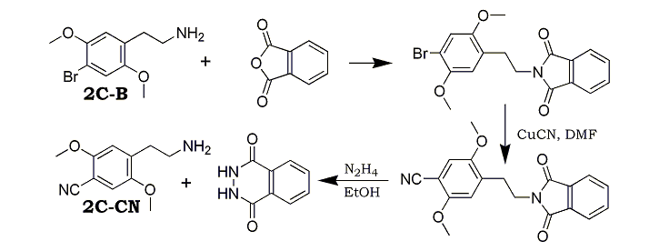 The above phtalimide (9.2 g, 27.38 mmol) and hydrazine (2.2 mL, 68.55 mmol, 98%) in 50 mL of anhydrous EtOH were heated under reflux for 15 min. After the mixture was cooled, the phthalazinedione was filtered off, and the filtrate was evaporated to give a solid residue. The solid was dissolved in H2O and extracted with CHCl3. The organic extract was washed with aqeous Na2CO3 (10%, 3x100mL), dried (Na2SO4) and evaporated to give 3.6 g (64%) 2C-CN. The HCl salt (precipitated from ether) was recrystallized from EtOH, mp 220-222°C.