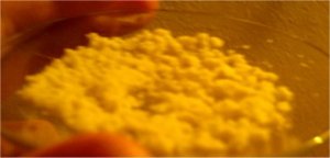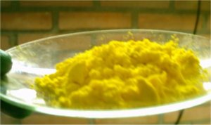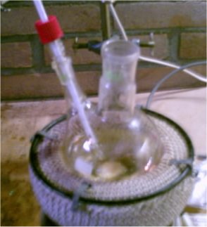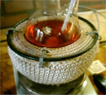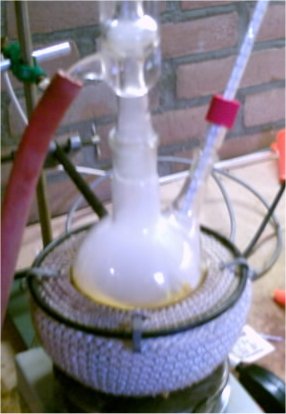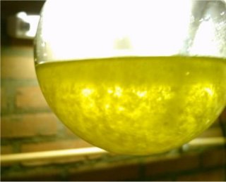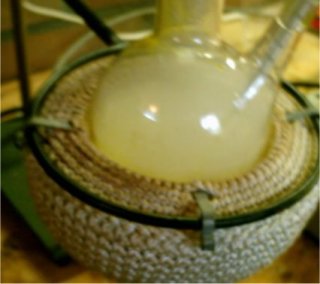 When the solution had cooled down to to 60?C it was decanted into a beaker for quicker cooling this left a lot of smoke in the RBF, after adding some H2O to the RBF the smoke cleared up and caused formation of some residue yellow crystals.