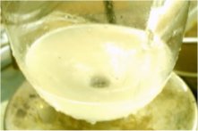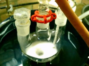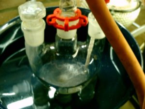 The addition caused the temperature never to exceed 25?C, during the addition the solution changed very quickly from yellow to white the last portions made the solution somewhat pink before turning milky white again. Upon completion of the addition the creamy white solution was stirred for 30 more minutes.