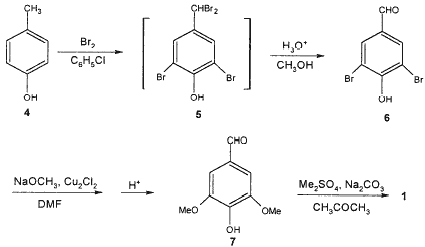 As Scheme 2 shows, the bromination of 4 in the solvent o-dichlorobenzene at 40°C and then at 160°C respectively gave the tetrabromide 5, and then the direct hydrolysis of 5 with H2O afforded 6 in an overall yield of 81.6% from 4. Using o-dichlorobenzene instead of chlorobenzene as solvent and one-pot method for the synthesis of 6 were one character of our procedure. GC/MS analysis shows that major by-product formed in the synthesis of 6 was 3,5-dibromo-4-hydroxybenzoic acid (<1%) while another possible by-product 3,5-dibromo-4-hydroxybenzyl alcohol was not detected. de la Mare and Newman9-10 reported that the hydrolysis of 2,6-dibromo-4-dibromomethylphenol 5 was very rapid to give 6, which was easily oxidized to afford the corresponding acid. It is consistent with our experimental results. Treatment of 6 with 3.7–3.9 equivalents of freshly prepared sodium methoxide (ca. 28–30 wt%) in the presence of catalytic amount of cuprous chloride11 and DMF at 120°C12 in autoclave gave sodium phenolate of 3,5-dimethoxy-4-hydroxybenzaldehyde 8. The sodium phenolate was directly methylated with dimethylsulfate in NaOH aqueous solution, affording 1 in the yields of 80.0–82.6%. Methanol was used as solvent for methoxylation of 6. Only small amount of DMF was used as a co-solvent. Using H2O as solvent for the methylation of 8, NaOH can act as a good acid-capturing agent and thereby the reaction time was shortened to 2–3 h. Hence, conventionally used solvent acetone is unnecessary. The use of the high concentration of sodium methoxide and the utilization of the adequate crystallizability of 8 for isolation are the other two characters of our procedure.