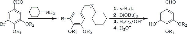 Consequently, we have developed an indirect procedure for the replacement of a bromine with a hydroxyl group in the readily available bromobenzaldehydes 1. These can be converted to the corresponding 5-hydroxy counterparts 3 in good to excellent yields through lithium-halogen exchange3 of the cyclohexylamine adducts 24, conversion of the lithio derivatives to organoboranes with B(OBu)35, oxidation of the C-B bond with basic hydrogen peroxide6, and finally, hydrolysis of the protecting Schiff's base.