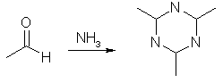 Place 260 mL of 23% sulfuric acid in a 1500-mL Florence flask. Connect an addition funnel to the flask, and set it up for vacuum distillation with a 500-mL receiving flask. The receiving flask should be immersed in a salt-ice bath to cool the distillate when it comes over. Although a setup for vacuum distillation is used, it is not necessary to apply a vacuum; the vacuum adapter merely provides a means of equalizing pressure. Prepare a solution of 100 g of sodium dichromate in 200 mL of water and 127 mL of ethyl alcohol. Factor in the amount of water that is already in the ethyl alcohol when making the solution, i.e. 100 mL of 95% alcohol has 5 mL of water in it already. Place this solution in the addition funnel, position the stem of the funnel so that it is about 3 cm above the surface of the acid. Heat the acid until it just begins to boil, then add the mixture in the funnel in a steady stream to the acid. It will not be necessary to heat the flask during the addition because it will generate its own heat. The heat will be sufficient to distill over the acetaldehyde along some alcohol and waste acetal. If acetaldehyde vapors begin to escape from the flask, regulate the distillation by decreasing the amount of dichromate solution being added. If the reaction flask does not boil on its own, gently heat it for a short time until boiling begins. Acetaldehyde Ammonia Trimer