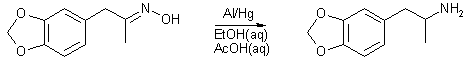 It should also be noted that the following solvent/redxn system was sucessfully employed in the manufacture of MMDA and DMMDA but in lower yeilds, 10% and 50% respectively. It failed repeatedly with DMMDA-2 altogather. Experimental In a 4l beaker with mag stirring, 0.75 moles of activated Al (19.5g) [1] is added to 1l 95% EtOH and 100mls dH2O, followed by 0.33 moles oxime of MDP-2-P (65g) [2],and 3 moles HOAc (180g). The Rxn is heated to 60C and heat removed. There follow three additions of 0.75 moles of activated Al at 30 minutes, 1 hour, and two hours. Temperature was maintained at 60C by placing beaker in a cold water bath as necessary. There is a vigourous evolution of hydrogen as the rxn progresses, care must be taken the rxn vessel does not overflow. An additional 150mls 95% EtOH and 15mls dH2O is added at 2hours. At 3 hours the rxn is a viscous gel which has stopped the stir bar. An additional 300mls 95% EtOH and 30mls dH2O is added . The rxn was allowed to stir until it has returned to room temperature, during which time 1 l of 15M NaOH was prepared and cooled. The rxn vessel was placed in a cold water bath and the basic solution was added slowly over 20 minutes, with care being taken the tempertaure did not rise above 60C. 500g of NaCl was added, much of which precipitated after stirring. 500mls toluene is added with stirring. The toluene/EtOH/amine layer is separated and decanted into 750mls of dH2O, causing the EtOH to migrate to the aqueous layer. The toluene layer is separated and the aqueous/alcoholic layer is extracted 2 times with 250mls toluene. The pooled toluene extracts are washed once with 400mls dH20 and once with 400mls brine, then dried through MgSO4 and gassed w/ dry HCl gas, furnishing 54g MDA HCl (0.267 moles, 81%) .