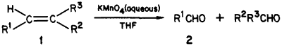 Oxidation of olefin-type substrates with KMnO4 yields mostly dihydroxylated or hydroxy oxo products in alkaline or neutral media, and the double bond is cleaved to the corresponding acids in acidic solutions1-9. A series of studies on the mechanism and intermediates of such oxidations in aqueous solution have revealed the transient formation of aldehydes, which, however, undergo further oxidation by manganese(II) and/or manganese(IV) intermediates8. No attempt was made at utilizing the cleavage reaction on a preparative scale, although the possibility of quenching the manganese intermediates for saving the aldehydes had been pointed out8b-e. Under phase-transfer conditions, isolated examples of olefin to aldehyde conversion have been reported2,7. There is, however, no convenient procedure for double bond cleavage to aldehydes in aqueous organic mixtures which would not require special additivies (phase-transfer agent) or techniques (chemical quenching). We now report a simple method in THF/water, in which the solvent plays the role of a quenching reagent, permitting good yields of the aldehydes.