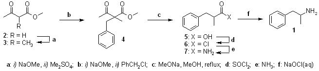 Acetoacetic Ester Synthesis of Amphetamine[ Back to the Chemistry Archive ]Amphetamine (1) can be synthesized by the sequential alkylation of methyl acetoacetate (2) with dimethyl sulfate and benzyl chloride, followed by hydrolysis and deacetylation to give 2-phenylpropionic acid (5), which through reaction with thionyl chloride and ammonia forms 2-phenylpropionamide (7). Upon treatment with aqueous sodium hypochlorite, this amide undergoes Hofmann rearrangement to form racemic amphetamine (phenyl-2-aminopropane). The order in which methyl acetoacetate is alkylated with dimethyl sulfate and benzyl chloride is of utmost importance to produce the desired dialkylacetoacetate isomer. If methyl acetoacetate is benzylated before it is methylated, the methyl group adds to the benzylic carbon instead of on the acetoacetate alpha-carbon. By first methylating the sodium salt of methyl acetoacetate and then benzylate the sodium salt of the formed alpha-methyl-acetetoacetic ester, the formation of the desired isomer is ensured. Methyl acetoacetate (2) was prepared from methyl acetate in good yields. Results of experiments using dimethyl sulfate or methyl iodide to alkylate methyl acetoacetate (2) indicated that it was possible to get a higher yield of methyl methyl acetoacetate (3) using methyl iodide, but its higher cost do not warrant its use. Instead of using the route going through intermediates 5-6, tests indicate that methyl benzyl methyl acetoacetate (4) will be transformed to 2-Phenylpropionamide (7) in 25% aqueous ammonia to the extent of approximately 50% in two weeks, standing at room temperature.