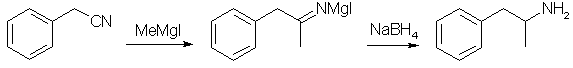 Novel One Pot Amphetamine synth from BzCN, MeMgI and NaBH4by RhodiumIntroductionThe alkylation of benzyl cyanide (phenylacetonitrile) with methylmagnesium iodide affords Phenyl-2-imino- propane, which is directly reduced with NaBH4 without isolation of the intermediate to give racemic amphetamine. The same procedure with Benzylmagnesium chloride and acetonitrile will yield the same intermediate imine, which of course can be reduced in the same fashion as done in this document.
