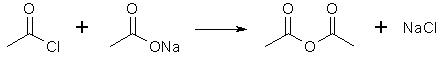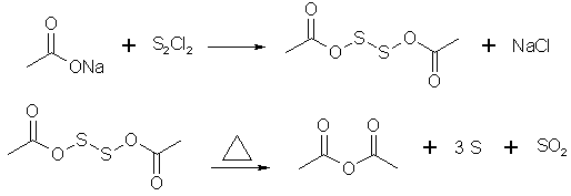 Prepare 100g freshly fused NaOAc and 65g S2Cl2. A small quantity of NaOAc is placed in a thin-walled glass cooled in an ice bath. To this is added some sulfur chloride, the mixtr is vigorously stirred w/a wooden spatula, not allowing the temp to rise. Then some NaOAc is added again, and the process is repeated several times until all is mixed in. The semi-liquid mass is transferred into a 1 liter RBF. The previous operation is repeated 4 times, so that 400g NaOAc and 260 g S2Cl2 total are taken into work. The RBF is then equipped w/a reflux condenser and gently heated on a water bath to ~80-85°C. As soon as the rxn starts, the heating is removed, and in case the rxn gets too vigorous it's cooled w/cold water. After 20-30 min SO2 evolution ceases and the mixture is heated for 10 more min's on a boiling water bath. The rxn product is then distilled off under vacuum, then fractionally re-distilled at ordinary pressure, collecting the fraction boiling between 132-142°C. For further purification it's distilled with 2-3% KMnO4 or K2Cr2O7 for breakage of sulfurous contaminants (test for their presence: 1 ml of the distillate upon neutralization w/pure NH3 mustn't give a dark precipitate on treatment with Pb(AcO)2) The yield is ~90% based on S2Cl2. Another similar synthesis, generating sulfur chloride in situ: Mix quickly and thoroughly 205-215 g of pulverized fine NaOAc and 10g dry sulfur powder, the mixture is quickly transferred to a wide-mouth 1 liter RBF and wetted w/25 ml acetic anhydride. Into the flask through the rubber cork extend 1) a wide tube for chlorine in-flow 2) an overhead stirrer, which is sealed with the aid of a piece of rubber tubing greased with vaseline and 3) an out-leading tube for excess Cl2 release. The flask is immersed in an ice-bath. Chlorine is initially passed in very carefully, with frequent stirring or shaking, over the passage of time the rxn gets hotter and more and more liquid, so the stirrer may bee after some time rotated with a motor. Chlorine stream should bee regulated so that almost all of it is absorbed. When the reaction mixture stops heating and Cl2 is no longer taken up, the rxn contents are distilled in vacuo at oil bath temp ~150-180°C, then redistilled at ordinary pressure, collecting the fraction boiling between 132 and 142°C. Yield ~90%. A Mild Method for the Synthesis of Carboxylic AnhydridesGeneral Procedure, exemplified for Propionic Anhydride:Propionic Acid + Methanesulfonyl chloride --Et3N--> Propionic Anhydride To a stirred solution of propionic acid (2 mmol) and methanesulphonyl chloride (1.05 mmol) in dry THF (10 ml) at -15°C under nitrogen was added triethylamine (3.5 mmol) in THF (5 ml) slowly over 20 minutes. After stirring 1 hour at -15°C the reaction mixture was allowed to warm to room temperature. The reaction mixture was filtered through Celite and the solvent was evaporated off under reduced pressure. The anhydride was isolated by short-path distillation (yield: 85 %, bp: 70-72°C / 20 Torr (lit. bp: 67.5°C / 18 Torr)). Reference: