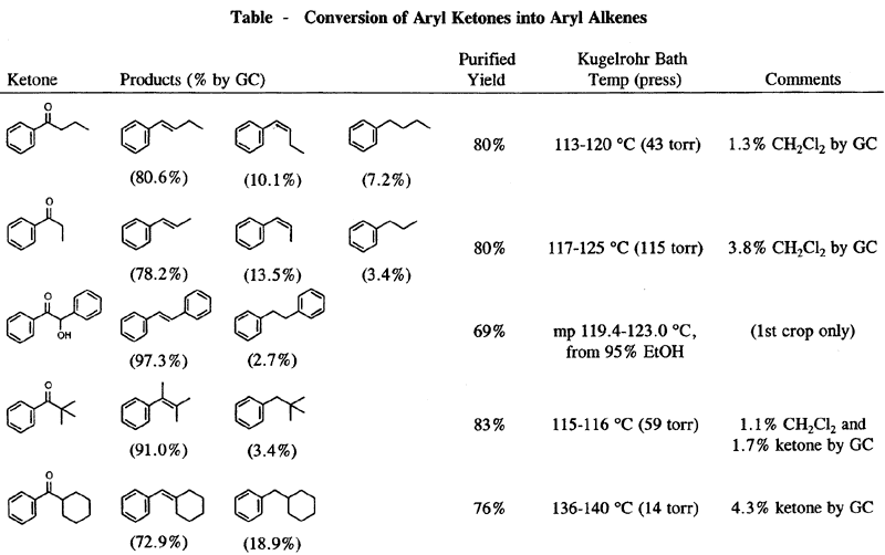 Aldehydes and ketones play a central role in the synthesis of a wide variety of organic compounds. Often the carbonyl group must be removed from a compound when its properties are no longer needed. One of the more commonly used methods for converting carbonyl groups into methyl or methylene groups is the Clemmensen reduction. We wish to report a modification of the Clemmensen reduction procedure which produces aryl alkenes directly from aryl ketones (Eq 1).