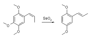 (a) A mixture of β-asarone (70g), alcohol (100ml), and selenium dioxide (10g) was heated on the water-bath for 30 min. The filtered solution was poured into water, the oil dissolved in ether, and the dried ethereal extract evaporated; the residue partly crystallised, and distillation gave asarone (60g).
