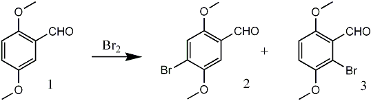 A cold solution of 20.0 g (0.12 mol) of 2,5dimethoxybenzaldehyde in glacial acetic acid (115 mL) was treated with 20.0 g of bromine in glacial acetic acid (60 mL). The solution was stirred at room temperature for 2-3 days and diluted with ice water. The yellow precipitate was collected by filtration and dried (28 g, 95%), mp. 118-126°C (lit.1 mp 125-126°C). Recrystallization from ethanol gave 15.20 g of 2, mp 132-133°C (lit.2,3 mp 132-133°C). Ethanol was removed from the mother liquor in vacuo and the residue was subjected to column chromatography (silica gel, benzene). The solid (10.4 g) collected in initial fractions was 4-bromo-2,5-dimethoxybenzaldehyde (2), total yield 25.6g (87%), mp 132-133°C. Subsequent fractions gave 1.5g (5%) of 6-bromo-2,5-dimethoxybenzaldehyde (3), mp 102-103°C (EtOH).