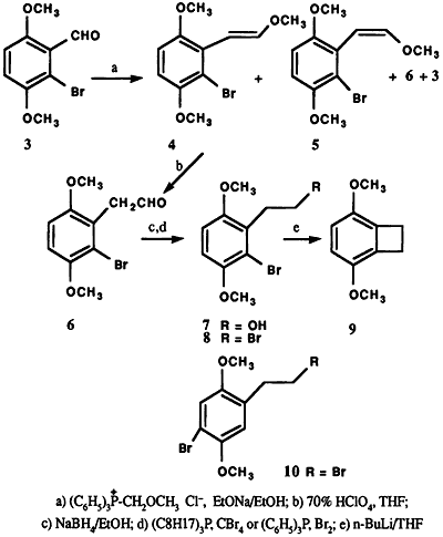 Hydrolysis of the E-Z mixture (4,5) with 70% perchloric acid in tetrahydrofuran9,10 at room temperature furnished 6 in 98% yield. Reduction of the aldehyde 6 with sodium borohydride in 95% ethanol at 50°C afforded the alcohol 7 (86%). Conversion of the bromo alcohol 7 to the corresponding bromide 8 (62%) was effected utilizing tri-n-octylphosphine and carbon tetrabromide11 or triphenylphosphine dibromide12. Finally, lithium halogen exchange of 8 with n-butyllithium in dry tetrahydrofuran (-105°C to -95°C), followed by intramolecular cyclization upon warming, provided the benzocyclobutene 9 (Scheme 1)13. A similar synthetic sequence starting from the bromo isomer 2 resulted only in the isolation of the dehalogenated end products, as would be expected, upon attempted cyclization of 10, mp 75-76°C (EtOH)14. Only the regioisomer 8 with bromine atom ortho to the bromoalkyl side chain would readily undergo intramolecular cyclization, following the reaction conditions used, to form the cyclic product 9.