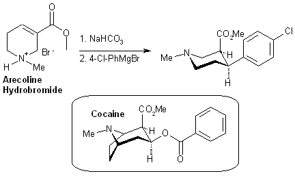 Synthetic Outline The Arecoline freebase was prepared by treating the Arecoline Hydrobromide of commerce with concentrated aqueous sodium bicarbonate, followed by extraction with methylene chloride, thorough drying of the extracts over anhydrous Magnesium Sulfate, followed by suction filtration and evaporation of the solvent in vacuo. The freebase was then used as is in the next step. To a solution of 166ml of 1M 4-chlorophenylmagnesium bromide in 700ml ether was added 12.9g of arecoline freebase in 300ml ether at -10°C. The mix was stirred at -10°C for 30 min, poured onto ice and treated with 200ml of 10% HCl. The aqueous layer was separated, washed with 200ml ether, cooled in an ice bath, and 100ml of saturated sodium bicarb. solution added. The solution was extracted with 2x100ml of ether, washed with brine, dried, and concentrated in vacuo. The crude mixture was crystallized from EtOAc/hexane to give racemic cis-isomer as a white solid (5g, 22%). Additional cis-isomer (Total: 12.4g, 56%, mp 98-99°C), as well as 2.0g (18%) of the trans-isomer was obtained by flash chromatography of the mother liquor. Another pertinent reference is US Pat 6472422, dealting with various cocaine analogs. References [1] Journal of Medicinal Chemistry, Vol 41, No 11, pp 1962-9 (1998)