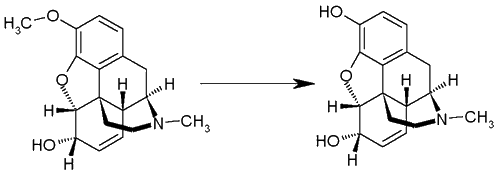 This text deals with four known methods of converting codeine to morphine by demethylation (codeine is morphine 3-methyl ether). Cleavage of aromatic ethers are commonly effected by reflux with concentrated HBr or HI. This relatively simple method can unfortunately not be used on codeine, as the oxygen bridge at the 9,10-position on the morphinan carbon skeleton would also rupture, causing the rearrangement of the molecule to the very potent emetic apomorphine, completely devoid of opiate-like effects.