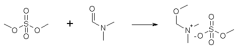 The reaction between N,N-dimethylformamide and an equimolar amount of dimethylsulfate (which takes two days at room temp, and two hours at 60-80°C, with no solvent added) furnishes the O-methyl complex of the amide. The formation of the complex is revealed through a change in viscosity and refraction index. Both DMF and Me2SO4 are soluble in ether, benzene and ethyl acetate, but their complex isn't. Upon attempted distillation of the complex, the components are re-formed. Ref: Angew. Chem. 73, 493 (1961) 1-Dimethylamino-2-nitroethylene