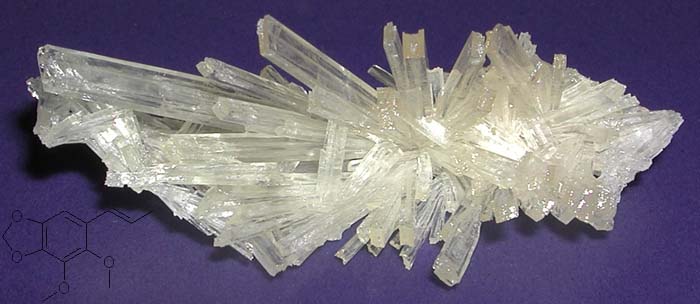 500mls of dillapiole [1] was refluxed with 10g of 85% KOH under medium vacuum for 11 hours, then transferred to a vacuum distillation rig and 450ml of iso-dillapiole was recovered at bp 145-146°C/6mmHg, it was recrystallized from an equivalent volume of boiling petroleum ether, yeilding 410g of clear 1-2 cm long prisms with a mp of 38°C [2]. 2,3-Dimethoxy-4,5-Methylenedioxy-Phenyl-2-Propanone
