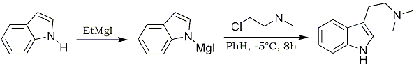 The reaction of indolylmagnesium iodide with substituted alkyl halides, e.g., the nitriles Cl(CH2)nCN and chloroacetyl diethylamide, to give the corresponding 3-substituted indoles is well established1,2 although very reactive halides, such as methyl iodide and benzyl chloride, occasionally give 1,3-disubstituted indoles3. We report now that indolylmagnesium iodide is alkylated by β-dimethylaminoethyl chloride to afford N,N-dimethyltryptamine4. The method appears to be general and, although the reaction conditions are critical, it provides a convenient direct synthesis of substituted tryptamines.