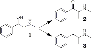 Reaction pathways of ephedrine [1], which may be