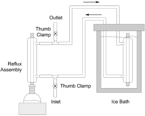 The technique entails connecting the reflux condenser in parallel with another condenser that is immersed in an ice-bath (Fig. 1). The reflux condenser inlet and outlet are each connected to a T-connector and are linked together by a section of tubing about a meter in length. This tubing is connected to a second condenser that is placed inside a two-liter insulated flask (cooler). Efficient cooling requires the complete exclusion of air bubbles, which is readily achieved by filling the system with water through the lower T-connector. When the system is completely filled with water the inlet and outlet tubing is sealed with a thumb clamp and the insulated bath is then filled with ice.
