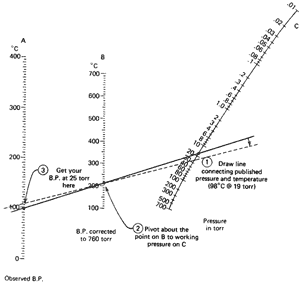 The pressure-temperature nomograph (Fig. 103) is really just a simple, graphical application of the Clausius-Clapeyron equation. If you know the heat of vaporization of a substance, as well as its normal boiling point, you can calculate the boiling point at another temperature. You do have to assume that the heat of vaporization is constant over the temperature range you're working with, and that's not always so. Where's the heat of vaporization in the nomograph? One is built into the slope and spacings on the paper. And, yes, that means that the heat of vaporization is forced to be the same for all compounds, be they alkanes, aldehydes, or ethers. So do not be surprised at the inaccuracies in this nomograph, be amazed that it works as well as it does.