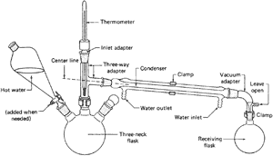 Make sure the entire thermometer bulb is below the side arm of the three-way adapter. If you don't have liquid droplets condensing on the thermometer bulb, the temperature you read is nonsense. Keep a record of the temperature of the liquid or liquids that are distilling. It's a check on the purity. Liquid collected over a 2°C range is fairly pure. Note the similarity of this range with that of the melting point of a pure compound (see Chapter 12, "The Melting Point Experiment").