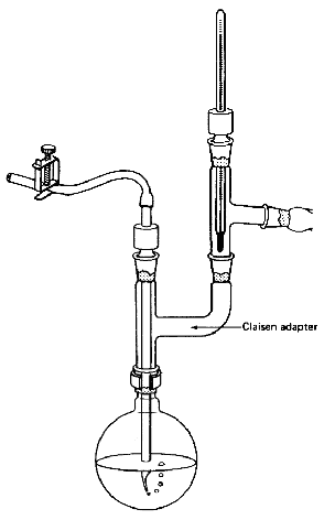 OK, you set all this stuff up to do a distillation. Everything's going fine. Clamps in the right place. No arthritic joints, even the vacuum adapter is clamped on, and the thermometer is at the right height. There's a bright golden haze on the meadow, and everything's going your way. So, you begin to boil the liquid. You even remembered the boiling stone, Boiling starts slowly, then more rapidly. You think, "This is it!" Read that temperature, now. Into the notebook: "The mixture started boiling at 26°C."