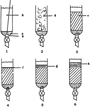 There are two central concerns in column chromatography: packing of the absorptive bed and sample application. This procedure, a modification of the short-column technique,2 effectively addresses both of these concerns. The steps to follow in packing a column are detailed in Figure 1. Note that the silica gel bed is first allowed to settle by gravity flow and then further compacted by application of air pressure.3,4 This assures a dense, evenly packed bed. Then, rather than application of the mixture to be chromatographed in liquid form, it is first evaporated onto coarse silica gel.5 This assures even application of the sample on to the top of the column and avoids concerns about mixtures that are not soluble in the (usually nonpolar) column solvent.