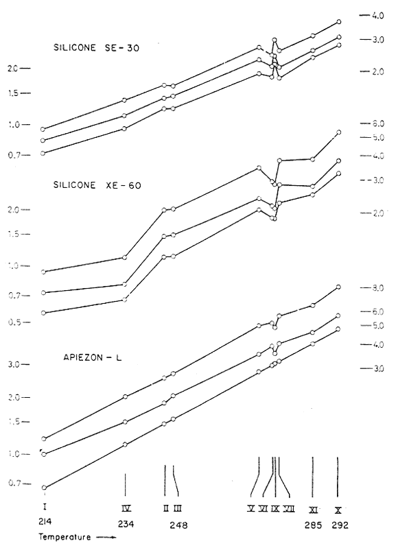 The Apiezon-L column appears to yield a separation, of one family to the next, that most nearly reflects the results that would be expected from high efficiency distillation. The other substrates produce a rearrangement of the order of emergence, but the sampling at hand is too small to establish any meaningful trends.