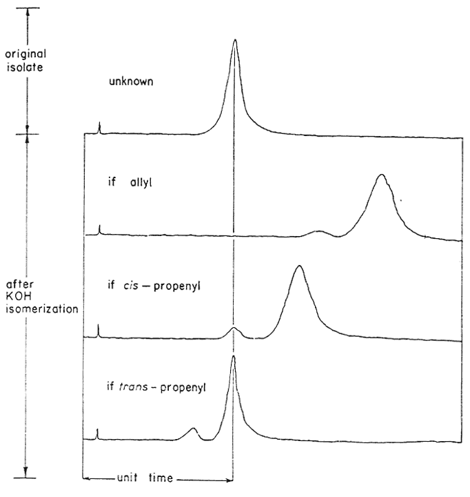 An effective and general tool can be derived immediately by the combination of this consistency of emergence with the isomerization properties of the allyl group. The base-catalyzed rearrangement of the allyl system to a mixture of the cis- and trans-forms of the propenyl counterpart has been mentioned above. The trans- is always favored, and the ratio of it to the cis- is given in Table III. It has been observed that this same end distribution is approached, although more slowly, by the rearrangement of either pure cis- or pure trans-propenyl material, in accordance with eqn. 4. Thus an unknown component isolated from a mixture may be readily assigned its chain configuration by comparing its time of emergence before and after treatment with alcoholic KOH, Five milligrams has proved to be quite sufficient for this purpose, employing the techniques described in the experiment section. The results of before and after are shown in Fig. 2, which presents the patterns observed with each of the three possible identities. Two complications have appeared and must he guarded against. The rearrangement of a trans-propenyl to the equilibrium mixture of cis- and trans- (the bottom presentation of Fig. 2) can be very slow, a period of several days being necessary to firmly establish the fore-running cis-component, Secondly, the protracted treatment of a methylenedioxy containing compound with alcoholic base leads to slow opening of this ring in accordance with eqn. 5.