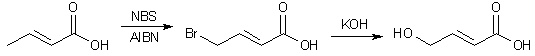 To a solution of 20g (0.23 mole) of crotonic acid (2-butenoic acid) in 200ml of dry benzene, 45.6g (0.25 mole) of N-bromosuccinimide was added under nitrogen. The solution was brought to a gentle reflux with stirring and was treated with 0.5g (3.7 mmol) of 2,2'-azobisisobutyronitrile as a radical initiator. Refluxing was continued for 2 h, and the solution was cooled to 10°C. The resulting white precipitate was filtered off, and the filtrate was evaporated in vacuo. The residue was taken up with 200ml of carbon tetrachloride and the mixture was cooled to 0°C and filtered. The filtrate was evaporated in vacuo to give 38 gram of a mixture consisting of 85% 4-bromocrotonic acid and the rest unreacted starting material. Pure 4-bromocrotonic acid can be obtained by multiple recrystallizations from petroleum ether.