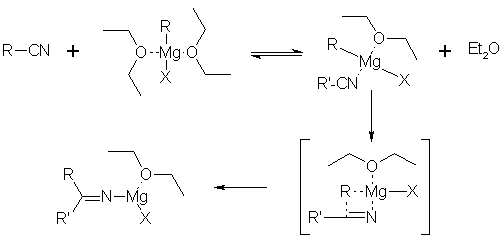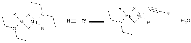 The formation of the complex supposes the coordination of the magnesium of the organomagnesium reagent with the nitrile and consequently, the displacement of one equivalent of solvent, in the case of diethyl ether, that play a role determining in the sequence of the reaction. Besides, it should be remembered that the different structure of the organomagnesium reagent in benzene compared with ether, is not negligible. In fact, in ether, the chlorides of the alkylmagnesium behave as dimers in the used concentrations while the bromides and the iodides change structure according to the concentration. They are monomers at a concentration 0.5 M and dimers at a concentration of 0.5-1.5 M [7]. On the contrary, in the aromatic solvents, and in the presence of one equivalent of ether, the reactivity of the Grignard, whatever the halogen anion, present themselves as dimers at low concentrations [8]. Consequently, we postulate the hypothesis that the increase in yields in the benzene is attributable to the reactivity of the organomagnesium reagent in this solvent, probably due to the facts that the partial desolvation of the reagent and the replacement of a molecule ether by a nitrile molecule as a coordinant of the magnesium, making the reaction go more easy (equation 2).