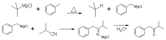 Thus at the time of the addition of the tert-butylmagnesium chloride, prepared according to the method of Leigh [11] (in toluene, in the presence of one equivalent of THF), one has isolated an aromatic ketone (28% by GC) instead of the anticipated trimethyl-2,2,4-pentanone. Spectroscopic and physical data identifies it without ambiguity as phenyl-1-methyl-3-butanone-2 [12]. The same ketone (phenyl-1-methyl-3-butanone-2) has been obtained (18% by GC) while refluxing isobutyronitrile with the same grignard reagent, prepared in ether, but the solvent replaced by toluene after evaporation. One notes that the increase of polarity of the solvent favor, even at that temperature, the transformation of the tert-butylmagnesium chloride into the benzylic counterpart. At this stage, we do not have verified if the mechanism of this last reaction does effectively intervene with a single electron transfer [13], but it imported to note it as another parallel secondary reaction to the one already described. References [1] Kharasch et al. Grignard reactions of Nonmetallic Substances, PrenticeHall, New York (1954) pp. 769-772.