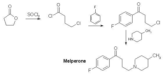 Synthesis of Melperoneby Psycho ChemistIntroductionMelperone is an antipsychotic, useful in the treatment of amphetamine schizophrenia. It can be used with combination of beta blockers to combat amphetamine overdose. All reagents are non-controlled, except gamma-butyrolactone, which is used in step 1. But the product from that step, 4-chlorobutyryl chloride, is non-controlled and commercially available. 4-chlorobutyryl chloride86 g gamma-butyrolactone (1 mol) and 100 mL thionyl chloride are mixed together with 1 g water-free zinc chloride, and refluxed 30 hrs with moisture protection. After recooling, the mass is vacuum-fractionated, the fraction boiling between 60-80°C at 15 mmHg contains the product. Yield about 100 g. 4-chloro-p-fluorobutyrophenone100 g (80 mL) 4-chlorobutyryl chloride are added dropwise to a well stirred suspension of 100 g anhydrous aluminium chloride in 500 mL fluorobenzene. With cooling, the internal temperature is kept at 25°C. After the addition, the whole is stirred 4 hrs and poured on 500 g ice. Precipated salts are dissolved by adding hydrochloric acid, the organic layer is separated, washed twice with water, and dried over sodium sulfate. The excess fluorobenzene (expensive!) is distilled off carefully and is recycled. The residue is vacuum fractionated to give 66 g (43% yield) of 4-chloro-p-fluorobutyrophenone, boiling at 150-175°C at 15-20 mmHg. Melperone, N-(4-(p-fluorophenyl)-4-oxobutyl)-4-methylpiperidine66 g 4-chloro-p-fluorobutyrophenone, 80 mL 4-methylpiperidine, and 1 g powdered potassium iodide are refluxed 20 hrs in 500 mL dry toluene. Thereafter, the precipated 4-methylpiperidine is suction filtered, and washed with 2x100 mL toluene. The combined filtrate is extracted twice with 300 mL 20% hydrochloric acid. The toluene layer is then discarded, and the acid layer is extracted three times with 200 mL chloroform. The combined chloroform extracts are evapoated to complete dryness (rotary evaporator), and the residue is suspended in 300 mL anhydrous acetone, all lumps are broken up manually. The white precipate is filtered of and washed twice with 100 mL anhydrous acetone. The filter cake, dry weight 85 g (86% of theory) consists of pure melperone hydrochloride. The dosage of melperone to treat amphetamine schizophrenia: 100-300 mg, depending on the severity of the case. It will not really supress tachycardia, so beta blockers should be additionally used. ![]() |