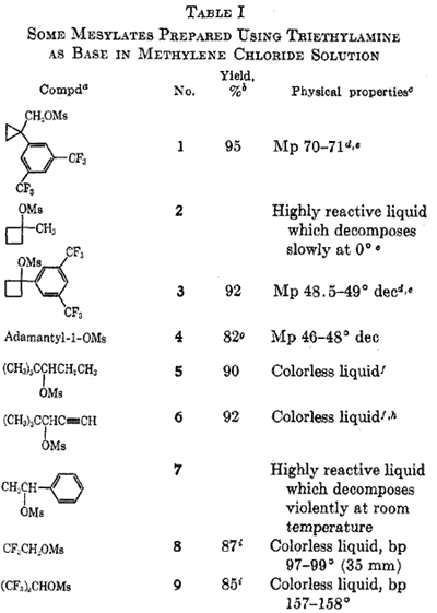 For some time we have synthesized methanesulfonate esters (mesylates) from the corresponding alcohols using a procedure based on the mechanistic studies of Truce10. We wish to report the experimental details of this procedure which is extraordinarily simple and rapid and appears to be of diverse applicability. Table I lists some of the mesylates prepared by this procedure. Repetitive integration of the 60MHz 1H nmr spectra showed that in each case the product was over 95% esterified. No by-products were observed. Our procedure deviates from the usual Tipson procedure4 by the use of triethylamine as base and DCM as solvent. In the light of recent evidence11, it is apparent that the mechanistic course of the reaction has been changed from the usual nucleophilic addition to the alcohol to the sulfonyl group to an addition of the alcohol to the sulfene12 derived from mesyl chloride by the E2 elimination of HCl11. The facile esterification of a number of tertiary and neopentyl systems (Table I) indicates that the reagent has a small steric requirement. The nucleophilicity of the alcohol is unimportant as shown by the ready esterification of 2,2,2-trifluoroethanol and 1,1,1,3,3,3-hexafluoro-2-propanol. Furthermore, conditions are sufficiently mild that even very reactive systems such as 1-methylcyclobutyl13 and alpha-phenyethyl may be esterified. Indeed, in our experience, all alcohols are esterfied by this procedure; the limiting factor seems to be the stability of the product14.