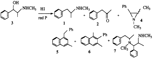 Products from the reduction of ephedrine with HI and red phosphorus.