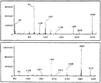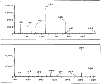 The EI and CI mass spectra of the neutral compound 10 are shown in Fig. 10. A M+1 ion was observed at m/z 280 in the CI spectrum, whilst the EI spectrum gave a base peak at m/z: 131. Purified samples of 10 were obtained after chromatographic separation of the oil on silica gel.