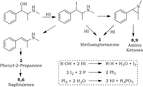 The synthesis of methamphetamine from pseudoephedrine via the reduction with hydriodic acid and red phosphorus was studied and the impurities which were generated, along with the methamphetamine, were investigated. Some of the impurities found have been reported previously, while the diastereoisomers of N-methyl-N-(α-methylphenethyl)-amino- 1-phenyl-2-propanone and the cis-cinnamoyl derivative of methamphetamine are reported here for the first time. Further work on the sequence of reactions occurring in this reduction is also reported.