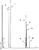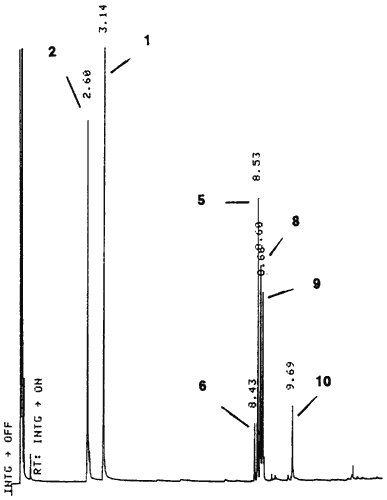 A solution of pseudoephedrine hydrochloride (5 g), red phosphorus (0.1 g) and hydriodic acid (10 ml) was heated under reflux for 5 h followed by the addition of water (12 ml). After standing overnight, the reaction mixture was rendered basic with 20% NaOH and the organic products extracted into ether. The ether extract was filtered and HCl gas was passed through the solution to precipitate the majority of the methamphetamine as the HCl salt. The ether was removed by evaporation to give a residual oil which was analysed by GC (Fig. 2). This oil was redissolved in ether and the basic compounds 8 and 9 and the residual methamphetamine were extracted with 10% HCl. The neutral impurities (mainly 2, 5, 6 and 10) remained in the ether solution. The individual impurities were further separated and purified by chromatography on silica.