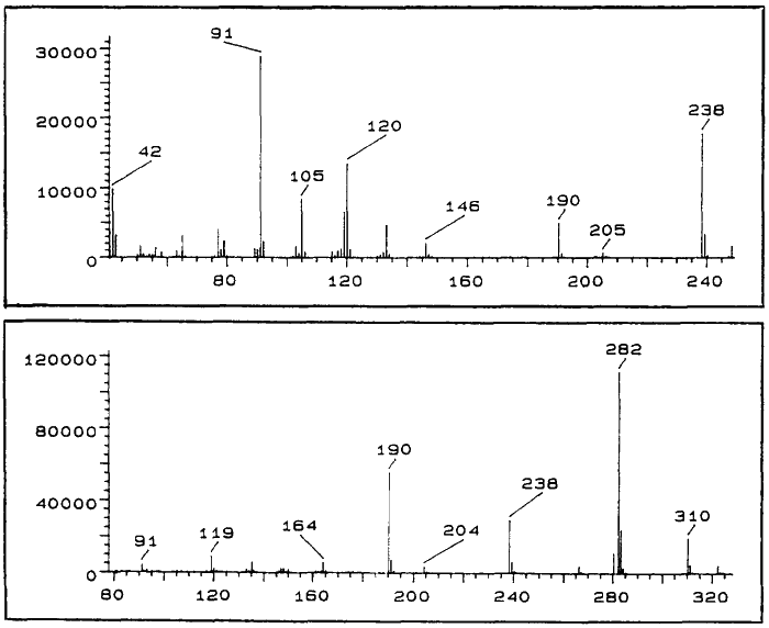 The EI and CI mass spectra of compound 8 are shown in Fig. 3. The spectra for 9 were almost identical, with only very minor variations in the relative peak intensities. These two compounds are isomeric with a molecular mass of 281 from the M+1 ion in the CI spectra at m/z 282. The highest mass peak in the EI spectra occurred at m/z 238. The loss of 43 eu to give this ion was also prominent in the CI spectrum. An acetyl (CH3C=O+) fragment could account for this loss, The presence of a carbonyl group in these molecules was confirmed by the presence of a peak at 1705 cm-1 in the IR spectra.