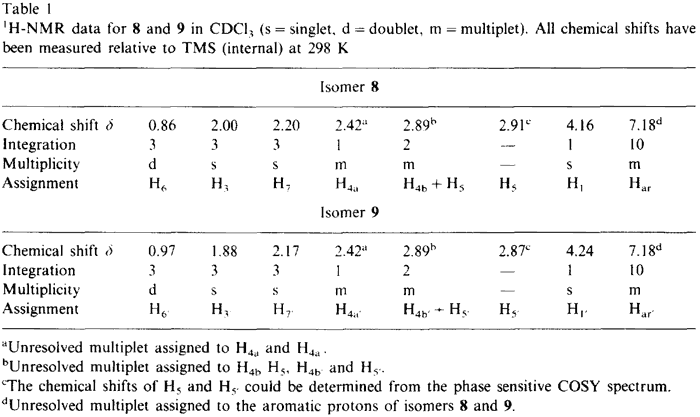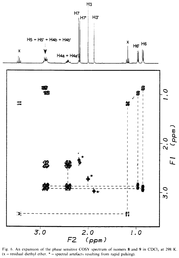 NMR data for 8 and 9 were acquired on a Bruker AM 300 spectrometer equipped with an Aspect 3000 computer, a variable temperature unit and a 5-mm broadband probe at 298 K. 1H-NMR data were acquired at 300.13 MHz over 8K data points with a spectral width of 3400 Hz; 32 transients were collected using a 20° pulse and a recycle delay of 3.3s. 13C-NMR data were acquired at 75.47 MHz over 32K data points with a spectral width of 22700 Hz. Approximately 20000 transients were collected (overnight) using a 30° pulse and a recycle delay of 1.5 s. COSY data were collected using the standard Bruker microprogramme COSYPHDQ.AUR; 2K data points were acquired in F2 with a 1H spectral width of 3400 Hz; 768 experiments of 16 transients were acquired in F1 with a 1H spectral width of 3400 Hz. Data were collected in phase sensitive mode and 90° phase shifted sinebell squared windows were applied in each dimension before transformation. HETCOR data were collected using the standard Bruker microprogramme XHCORRD.AUR; 2K data points were acquired in F2 with a 13C spectral width of 17200 Hz; 554 experiments of 128 transients were acquired in F1 with a 1H spectral width of 3400 Hz. Data were collected in magnitude mode. Line broadening of 3 Hz was applied to F2 and a sinebell squared window was applied to F1 before transformation. FUCOUP data were collected using the pulse sequence as specified by Halterman et al.10; 2K data points were acquired in F2 with a 13C spectral width of 17200 Hz; 768 experiments of 128 transients were acquired in F1 with a 1H spectral width of 3400 Hz. Data were collected in magnitude mode. A 90° phase shifted sinebell squared window was applied to F2 and a sinebell squared window was applied to F1 before transformation.