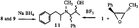 To trans-2-methyl-3-phenyloxirane (0.5 g) and methamphetamine (1 g) in diethyl ether, boron trifluoride diethyl etherate (0.52 g) was added dropwise with stirring. After stirring for a further 20 min, the reaction mixture was heated under reflux for 20 min. A 10% HCl solution was added followed by enough 20% sodium hydroxide to render the solution basic. The organic products were extracted into ether. Removal of the ether gave the desired alcohols (0.9 g) as an approximately 1:1 mixture of diastereoisomers.