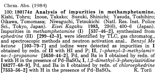 Even though the HI/red P ephedrine reduction method is relatively new (1982) in clandestine laboratories, the method has been known for many years and has been used to reduce carbonyl groups, nitrites, halides, and alcohols2,3. Reduction of ephedrine to methamphetamine is well documented in the literature. The configurations of ephedrine were determined by reduction of the chloro- and bromoephedrines by Emde4 and Schmidt5 using various reduction methods not including the HI/red P method. Emde incorrectly cites Ogata6 as producing (+)-methamphetamine in 1919 by heating (-)-ephedrine or (+)-pseudoephedrine with HI and yellow phosphorus. The clandestine manufacture of (+)-methamphetamine from (-)-ephedrine or (+)-pseudoephedrine is a very simple process. A mixture of ephedrine, red phosphorus, and hydriodic acid is heated, filtered, made basic, extracted, and crystallized as the hydrochloride salt from ether/acetone with hydrochloric acid or hydrogen chloride gas or from trichloromonofluoromethane (i.e. "Freon-11') and hydrogen chloride gas. The salt is filtered and dried. The theoretical yield is 92% by weight of the precursor ephedrine, whereas the clandestine yields range from 50 to 75% by weight of the precursor ephedrine. The final product varies from white to orange/brown in color. It is usually greater than 95% in purity and contains no ephedrine.