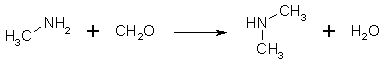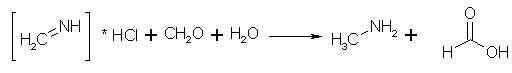 Figure 3: Methyleneimine, water and formaldehyde reacts to form methylamine and formic acid The methyleneimine is reduced by the water(!) formed above to give methylamine, while the formaldehyde is oxidized to formic acid, and is partly carried away as its methyl ester.
