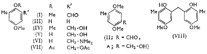 The second synthesis of compound (IV) was of poor yield. It involved a Mannich reaction of compound (III) with formaldehyde and dimethylamine5 yielding 2-dimethylaminomethyl-4-methoxy-6-methylphenol (VI), which, when heated with acetic anhydride6, gave 2-acetoxy-5-methoxy-3-methylbenzyl acetate (VII). This was hydrolysed with alkali and compound (IV) was obtained by methylation of the hydrolysate. A by-product of this reaction was bis-(2-hydroxy-5-methoxy-3-methylphenyl)methane (VIII), which may have arisen from the reversible decomposition of 2-hydroxymethyl-4-methoxy-6-methylphenol (V) to give 4-methoxy-2-methylphenol (III) and formaldehyde, followed by the condensation of compound (III) with compound (V) or with an intermediate arising from compound (V) by loss of a molecule of water.
