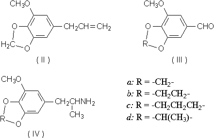 The establishment of trimethoxyamphetamine (Ib, TMA) as being of greater psychotropic potency than either a-ethyl mescaline (Ic)1 or mescaline itself (Ia)2 has led to the examination of analogues which retain the three carbon chain but vary in other areas of the molecule. The presence of elemicin (3,4,5-trimethoxy allylbenzene) in the aromatic ether fraction of oil of nutmeg3, and the proposal of a possible in vivo mechanism of its conversion to TMA4 have afforded an explanation of the psychotropic action5 of nutmeg. The substance myristicin (II) is the major component of this fraction, and if it were to undergo the transformation parallel to that proposed for elemicin, a second amphetamine, 3-methoxy-4,5-methylenedioxy amphetamine (MMDA, IVa), would result.