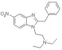 2-benzyl-5-nitro-benzimidazoleA solution of 17.5 grams of benzyl cyanide and 8.7 grams of ethanol is saturated with dry hydrogen chloride while stirring and cooling with ice water; the mixture is allowed to stand for 12 hours at room temperature and then stirred with a suspension of 15.3 grams of 2-amino-4-nitroaniline in 200 ml of dioxane. The reaction mixture is stirred for 24 hours at about 85°C, then boiled under reflux for four hours and finally, when still hot, rendered sharply acid with a mixture of ethyl acetate and hydrochloric acid. The hydrochloride of 2-benzyl-5-nitro-benzimidazole which crystallizes out is purified by recrystallization from dilute aqueous hydrochloric acid with the aid of animal charcoal. By adding aqueous ammonia, the free base is obtained which after recrystallization from a mixture of dioxane and ligroin melts at 189°C. 1-(N,N-diethylamino-ethyl)-2-benzyl-5-nitro-benzimidazole ("Nitazene")A solution of 68 grams of sodium ethylate in ethanol, as concentrated as possible, is added dropwise to 253 grams of 2-benzyl-5-nitro-benzimidazole in 3.0 litres of dioxane at 60°C with stirring. After the addition is complete, the sodium salt of 2-benzyl-5-nitrobenzimidazole, which has crystallized in the form of fine yellow needles, is suction-filtered and dried in vacuo at 60°C. To 27.6 grams of this sodium salt suspended in 600 ml of absolute dioxane there are added dropwise 13.5 grams of N,N-diethylamino-ethyl chloride at 60°C. Stirring is carried on for an hour at 60°C, the sodium chloride formed is filtered off, and the filtrate is evaporated. The resulting mixture of 1-(N,N-diethylamino-ethyl)-2-benzyl-6-nitro-benzimidazole and 1-(N,N-diethylamino-ethyl)- 2-benzyl-5-nitrobenzimidazole is separated into its two isomers in the following manner: After crystallizing the product twice from ether there is obtained pure 1-(N,N-diethylamino-ethyl)-2-benzyl-6-nitro-benzimidazole melting at 96-97°C. The mother liquor is evaporated and in ethanol the calculated quantity of ethanolic hydrochloric acid is added. The precipitated hydrochloride, after being repeatedly recrystallized from water, gives pure 1-(N,N-diethylamino-ethyl)-2-benzyl-5-nitro-benzimidazole hydrochloride melting at 199-201°C. Instead of the sodium ethylate solution there can be used a solution of sodamide in liquid ammonia (prepared from 200 ml of ammonia, 2.3 grams of sodium and 0.06 gram of ferric nitrate) for the condensation. Reference: Example 6 from US patent 2,935,514. |