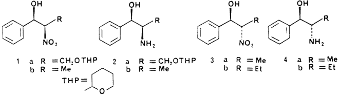 Thus transfer hydrogenation of the pure racemic syn3 nitro alcohol is in methanol solution gave the amino alcohol (2a) in 80% yield. None of the anti isomer was detected in the product by NMR spectroscopy. In the same way the nitro alcohols4 (1b) [syn:anti ; 1:8.1], (3a) [syn:anti ; 1:2.9], (3b) [syn:anti ; 1:3.2], (5a) [anti only], and (6a) [syn:anti ; 1:8.1] were converted into the corresponding β-aminoalcohols (2b) [44%, syn:anti ; 6:1], (4a)5 [61%, syn:anti ; 1:2.8], (4b) [87%, syn:anti ; 1.3.2], (5b) [73%, anti], and (6b) [58%, only anti observed].