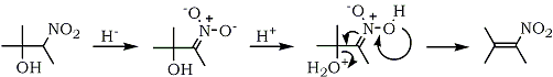 McMurry reported that mesyl chloride in DCM53 at 0°C, is a good dehydrating agent for nitroalcohols. It transforms the hydroxyl group into a more effective leaving group. Generally, good results are obtained (see examples below) using their approach with the exception of 1-nitro-1-propene, an unhindered nitroalkene, sensitive toward polymerization.