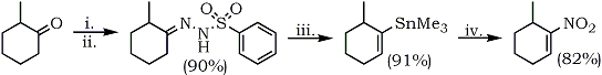 Corey and Estreicher75 reported an elegant synthesis or nitrocycloalkene from cyclic ketones which makes available unsaturated nitro compounds not previously accessible. Allyl nitro compounds can also be obtained using this methodology. The process is outlined in Scheme 6.